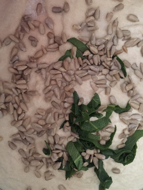 Kovászos kenyér az új edényben, zsályával, napraforgó maggal és kölessel