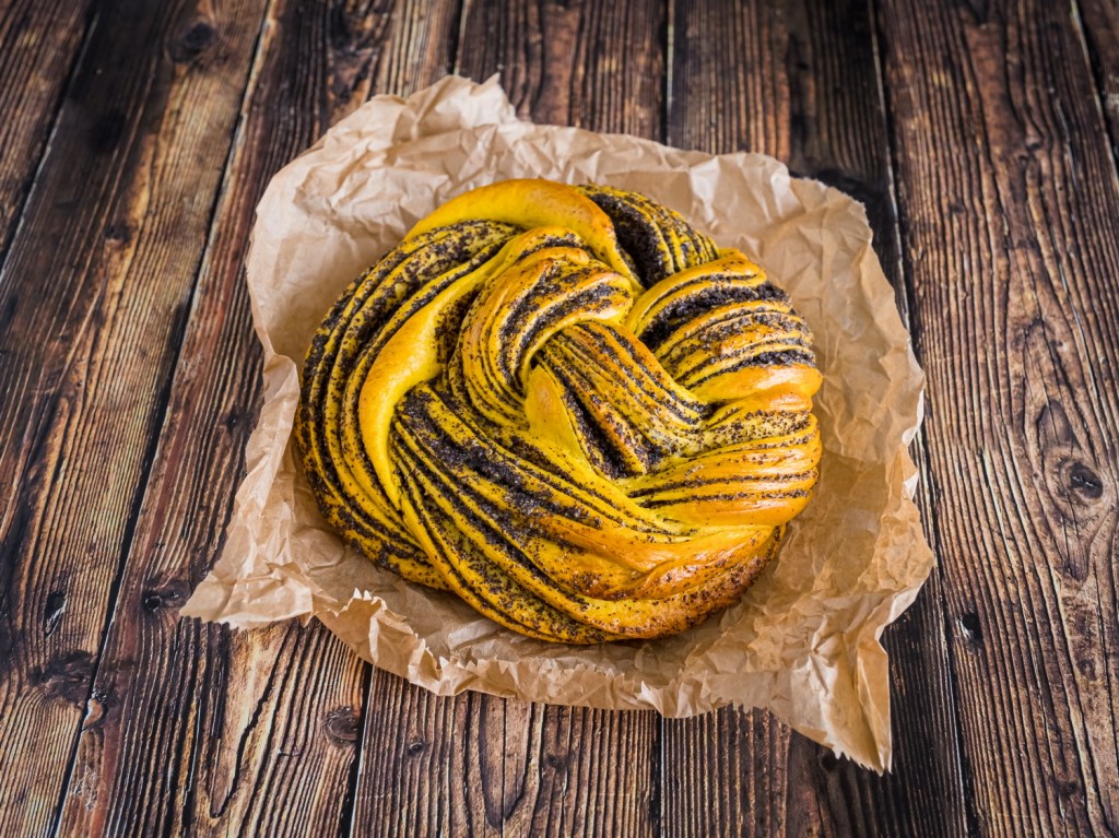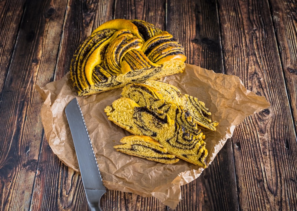 A tésztát ezután 20 percig pihentetem. Ha ez letelt, sodrófával hosszúkás téglalap alakúra nyújtom, és a felületét megkenem a töltelékkel. A rövidebbik feléről utána fetekerem a tésztát. Az így kapott hengert késsel félbe vágom, majd a két szálat összetekerem. Kicsit még nyújtok rajta, majd pedig mint egy klasszikus brióst (csiga biga forma) összetekerem. Ezután langyos helyen kelesztem 40 percig, a végén megkenem a tetejét tojással és megsütöm légkeverésen 190 fokban 28-30 perc alatt.