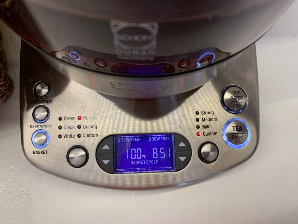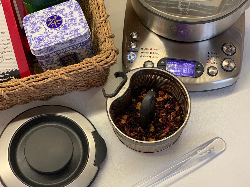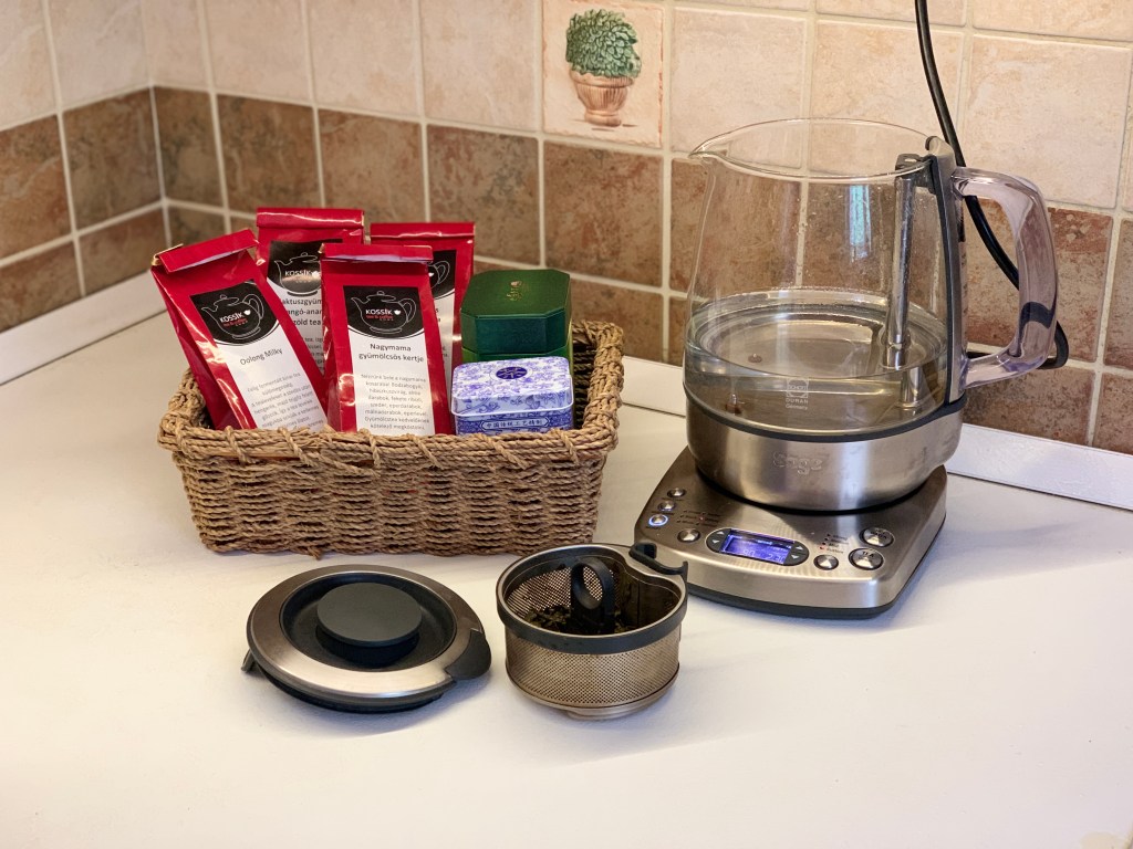 Első ránézésre nem értettem, mi olyan különös ebben a Sage teafőzőben, azon kívül, hogy jól néz ki, és vízforralásra is alkalmas. „Majd meglátod, mitől olyan különleges” – mondta a férjem azzal a sejtelmes mosollyal, ami után nem szoktak kérdéseim lenni. Így volt ez sok éve a malommal, aztán az Ankarsrum dagasztógéppel, az Émile Henry bread cloche-sal, és még egy pár dologgal. A gép mellé kezdésnek 5 féle teát vásárolt: taiwani vörös oolong-ot, hibiszkusz virágot, kínai zöld teát, earl grey-t, és fehér teát. A próbát a hibiszkusszal kezdtük, aminek kinyíló vörös virágai azóta is minden alkalommal lenyűgöznek. A készülékhez adott kiskanállal kimértem két adagot a hibiszkuszból, és a rozsdamentes merülő kosárba tettem. Meglepett, hogy ahogy a kosarat közelítettem ahhoz a rúdhoz, amire rá kell illeszteni, magától ráugrott, mágnesesen. Ez annyira tetszett, hogy többször is megismételtem a mozdulatot. Apró figyelmesség a gyártó részéről, de mégis hatalmas könnyebbség a használat során. Aztán, úgy mint ahogy régen a sütő előtt guggoltam és néztem hogy emelkedik a kenyér, úgy hasaltam a konyhapulton és bámultam, ahogy a kosár fel le csúszkál a rúdon, és a gép a kiválasztott tea típusnak megfelelő hőmérsékletűre felforrósított vízbe, megfelelő ideig áztatja a kosarat, benne a levelekkel. Minden merítés után egyre színesebb, illatosabb és ízesebb lett a tea.
