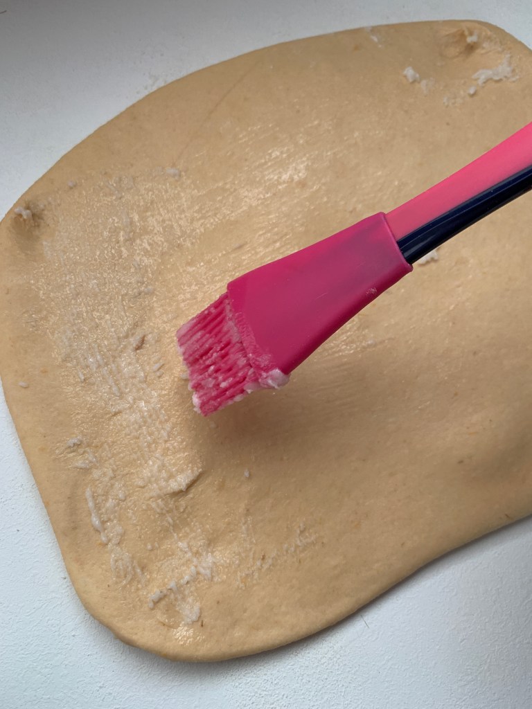 A többi hozzávalót bemérem az Ankarsrum dagasztótáljába. Ez keményebb tészta lesz, így a hengerfejet használom és nem a fém kart. Ha az élesztő jó habos, beleöntöm ezt is a dagasztótálba, és 3-4 percig 2-es, majd további 6-7 percig 4-es fokozaton járatom. Gyönyörűszép, narancsos tészta a végeredmény. Ez nem lesz hólyagos, fényes, ez egy összeállt keményebb massza lesz. Kiveszem a tálból, átgyúrom pár mozdulattal, felgömbölyítem, majd kb. 40 percet letakarva pihentetem.