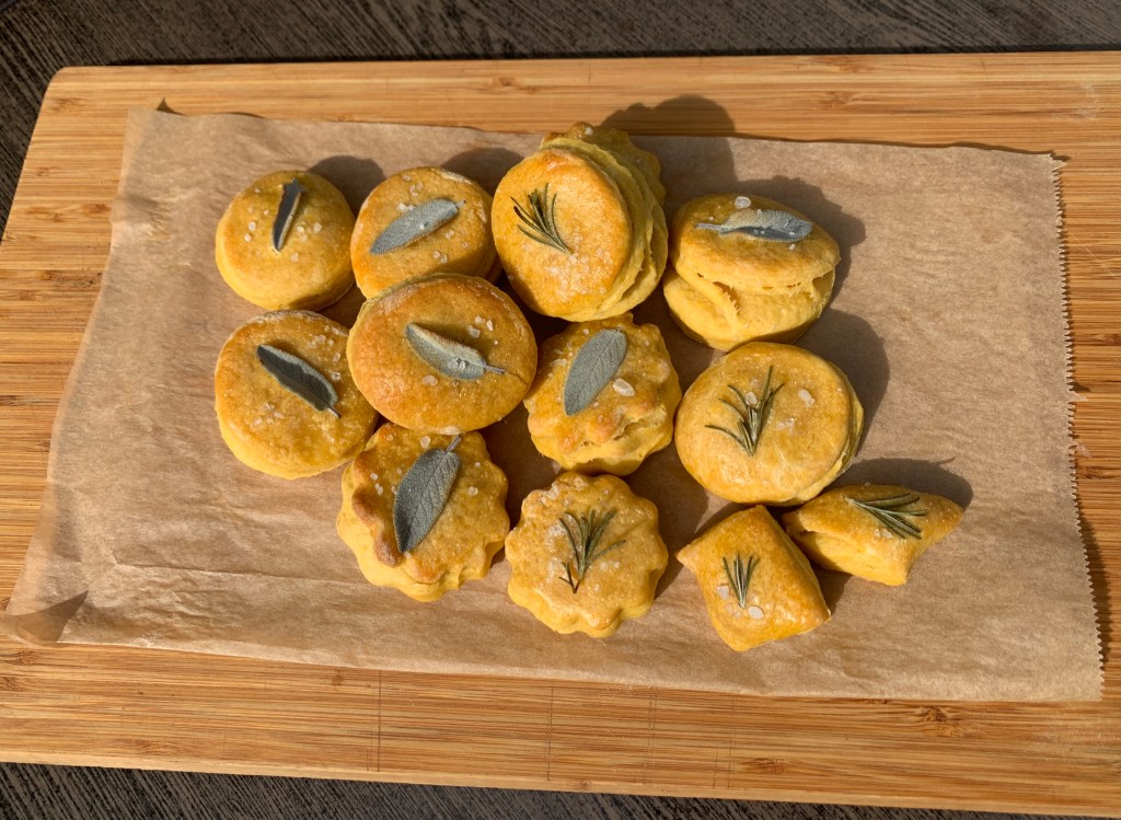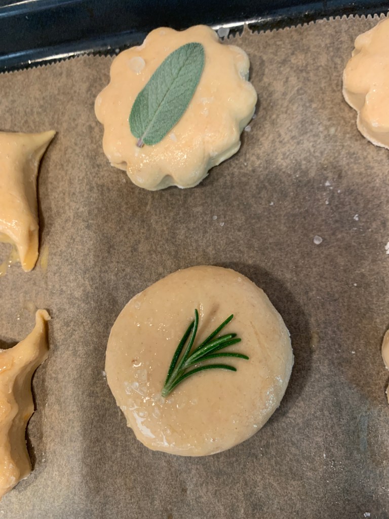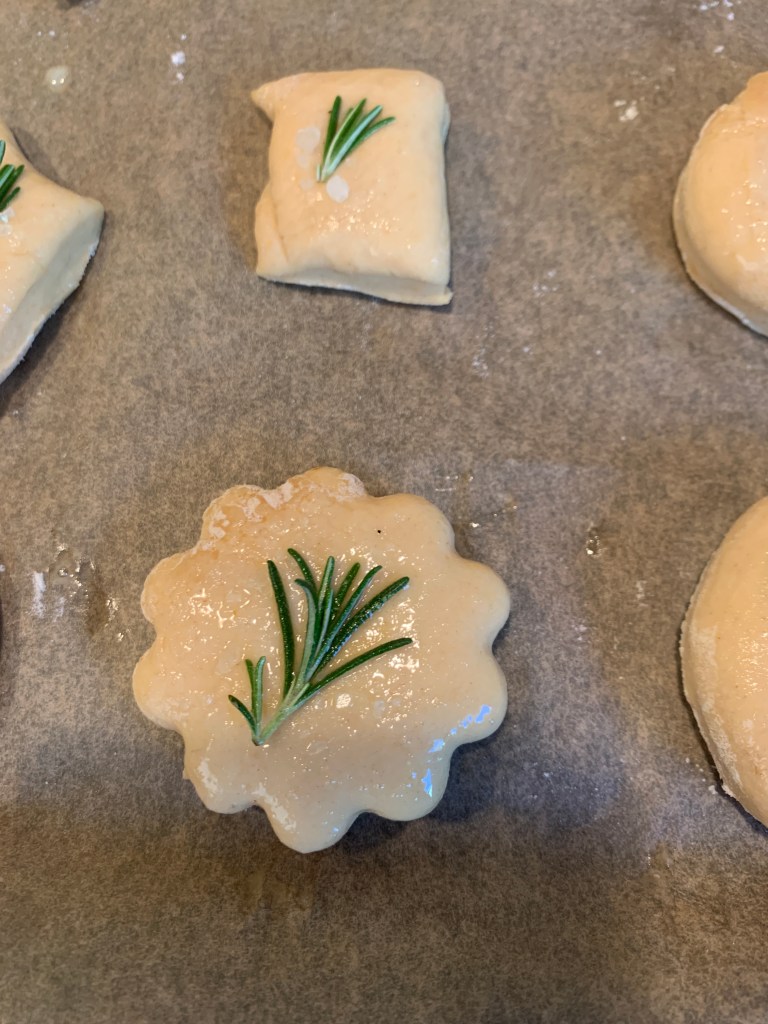 Ezután lisztezett pulton téglalap alakúra nyújtom, felületét megkenem olvasztott zsírral. A tésztát utána három részbe összehajtom, majd egy fóliába csomagolva megy fél órára a hűtőbe. Fél óra után a tésztát kinyújtom, ismét megkenem zsírral, és megint összehajtom. Ezután visszacsomagolom, majd megint a hűtőben hagyom, kb. fél órát-egy órát. Ezután kinyújtom (nem túl vékonyra), a sütőt 190 fokra előmelegítem, a pogácsákat kiszaggatom, tetejüket megkenem tojással és feldíszítem rozmaringgal, zsályával, és nagyszemű sóval. De persze ez lehet bármi: sajt, magok, fűszerek. Kb. 18 perc alatt megsütöm.