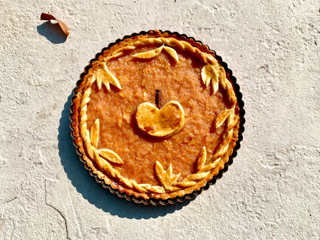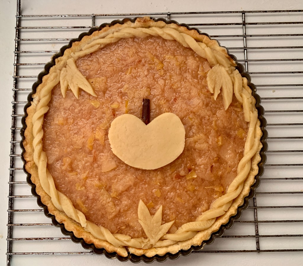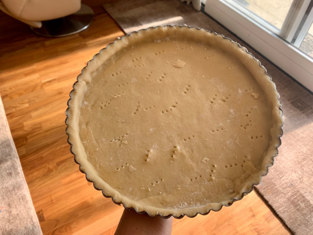 Lisztezett munkapulton a tésztát akkorára nyújtottam, hogy kényelmesen beleférjen a formába. A zsíros tészta teljesen ugyanúgy viselkedik, mint a vajas: szépen lehet nyújtani, rugalmas és újra összegyúrható. A széleket levágtam, a belsejét villával megszurkáltam, és a sütőben 170 fokon 15 percig elősütöttem. Eközben a megmaradt, levágott tésztákat újra kinyújtottam, és díszeket készítettem belőle – fonatot, leveleket, és egy almát, aminek a szára a birstöltelékből kiszedett fahéj volt.