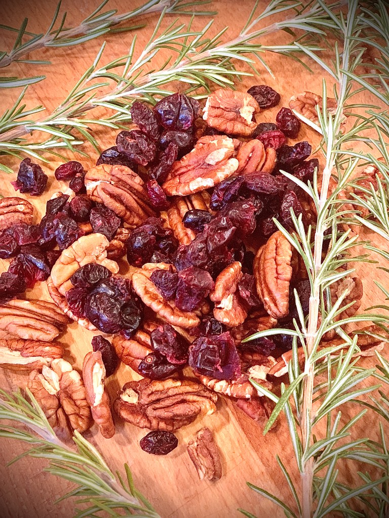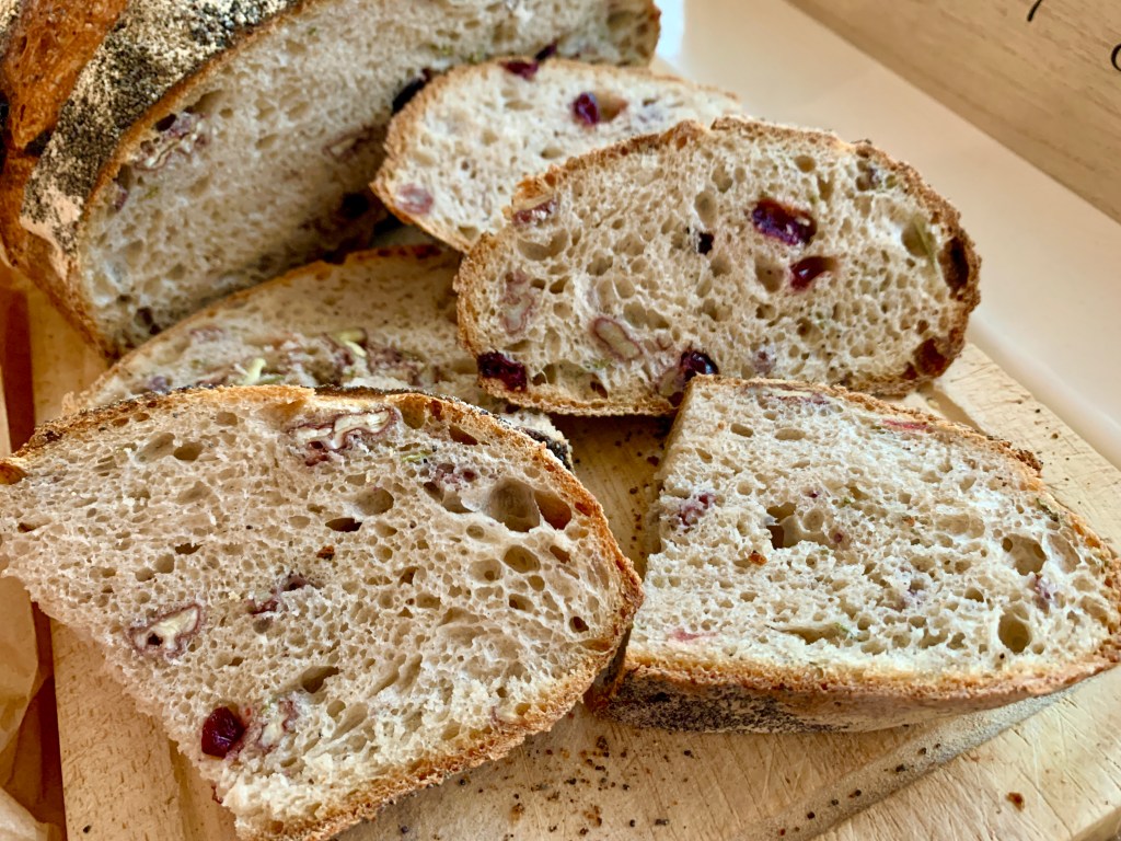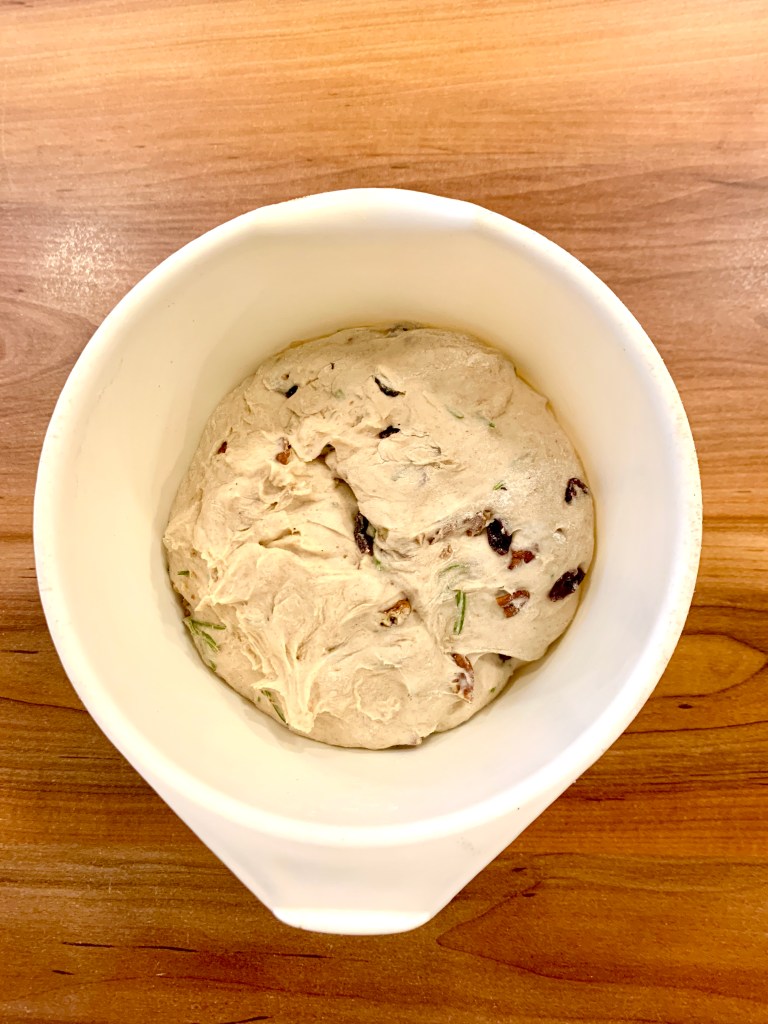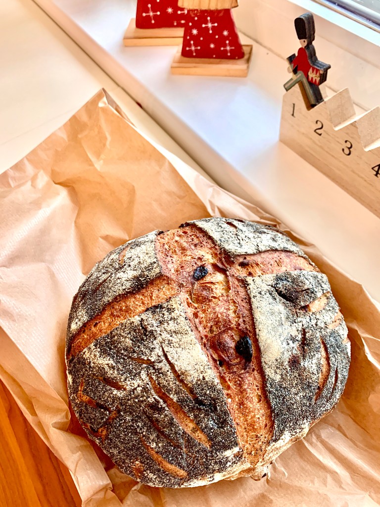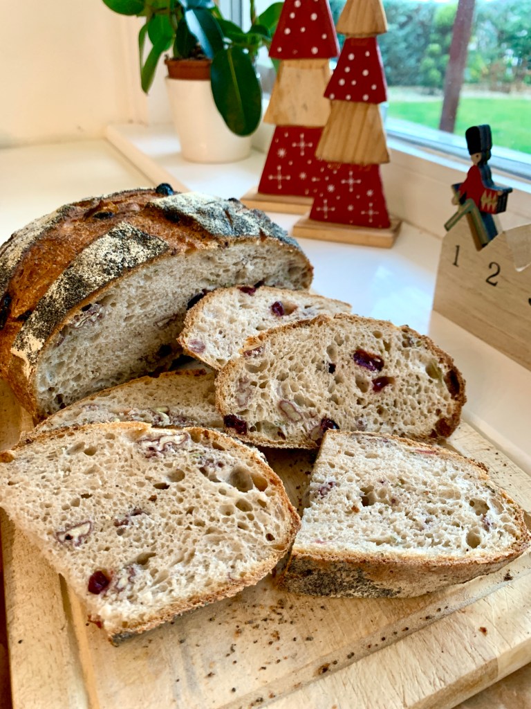 Minden évben bajban vagyok azzal, hogy milyen kenyér kerüljön a karácsonyi asztalra. Az ünnep napjain délben és este meleg vacsorát eszünk, de a reggelihez mindig is vágytam valami különleges kovászos kenyérre (a sok édesség miatt nem szoktunk kalácsot reggelizni). És valahogy, végre idén, minden erőlködés nélkül kipattant a fejemből a megfelelő összetevők listája. Illatos rozmaring a kertből, csodálatos rubin színű vörös áfonya, pirított pekándió és egy kis mák. Na és persze különleges vágás, mely passzol az ünnepi asztalhoz.