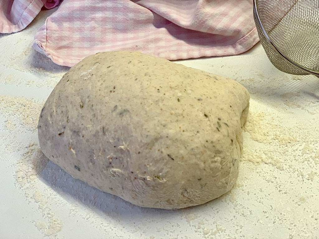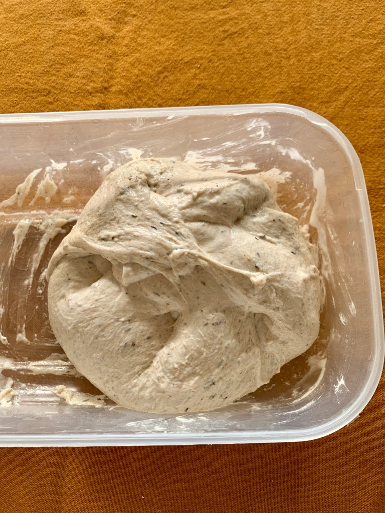 Ma egy olyan 78%-os hidratációjú rozskovászos félbarna kenyeret sütöttem, melynek a teljes elkészítési ideje kb. 40 óra volt és a tetejét vágás előtt nem liszteztem. Szerettem volna megnézni a sok buborékot a héjjon. A kertben van még egy pár friss fűszer, azzal bolondítottam meg a tésztát.