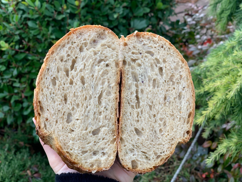 A kenyérnek csodálatos barna, buborékokkal teli héja van, szépen megnyílt a vágásnál (itthoni sütő lehetőségeihez mérten) és a bélzete jó szellős.