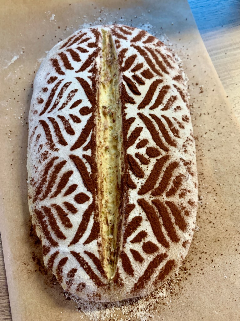 A sütőt felmelegítem 245 fokra, és egy fél órát ezen a hőmérsékleten járatom, benne a tepsivel, amin sütni fogok. Ezután a hűtőből kivett kenyeret egy sütőpapírra borítom, tetejét stencil segítségével dekorálom (most kakaóport használtam), majd bevágom, és beteszem a sütőbe. Gőzt csinálok és a sütési hőfokot egyből leveszem 235 fokra. Végig ezen sütöm a kenyeret 35 percig. Máskor magasabb hőmérsékleten szoktam sütni, de most nem szerettem volna se vastag héjjat, se sötétet. A bélzet átsülését maghőmérővel ellenőrzőm a sütési idő végén.