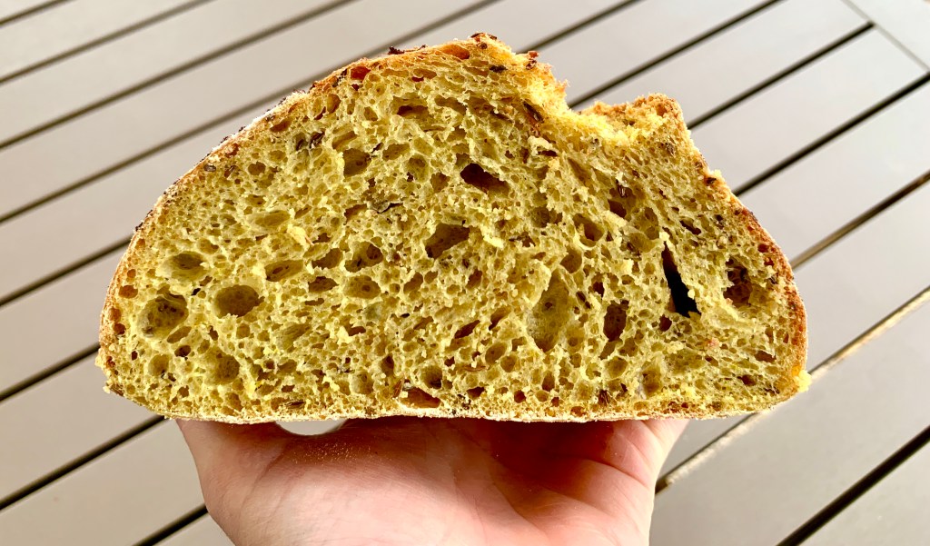 A hűtős érés során sokkal jobban összeérnek az ízek, több enzimes folyamat megy végbe és a héj is sokkal szebb lesz, a kenyér belsejében lévő buborékok szebbek, egyenletesebbek. Szóval, ha tehetitek, fermentáljatok minél hosszabb ideig 🙂
