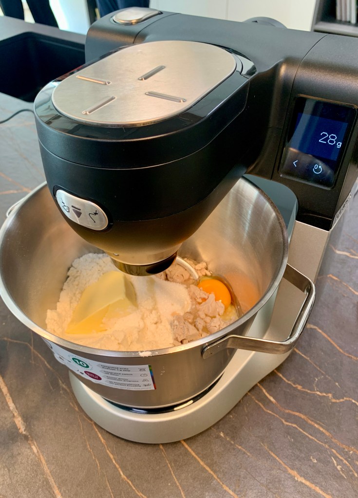 A külső után nézzük a többi tulajdonságot. A MUM6 az általam ismert készülékekhez képest abban volt más, hogy digitális a kijelzője és az állítógombja olyan okos féle (mindig világít az adott funkció és nem hagyományosan tekerős, hanem mindig egy állítással lehet arrébb vinni a funkciót rajta). Ezen kívül a felső egységen, amiben a motor van, egy mérleg található. És ami szintén meglepett, az alsóban is. Tehát, a dagasztótál egyből egy tárázható mérleg, ami jelentősen megkönnyíti a munkát. És, ha szükséges, közben felül is lehet mérni. Ez szuper egy olyan tésztánál, ahol később kell adagolni bizonyos hozzávalókat (mondjuk egy vajas kalács, ahol a vajat a dagasztás végén adjuk hozzá, vagy egy magos zsömle). Ilyenkor egy pillanatra megállítjuk a gépet, fent egy kis edénybe mérünk és már zúdítjuk is a dagasztó edénybe, és mehet tovább a dagasztás. Tehát nem kell konyhai mérleg a dagasztáshoz. Óriási jópont nálam! Minél kevesebb eszköz és edény, valamint mosogatnivaló keletkezik, én annál boldogabb vagyok. És úgy sejtem, más is.
