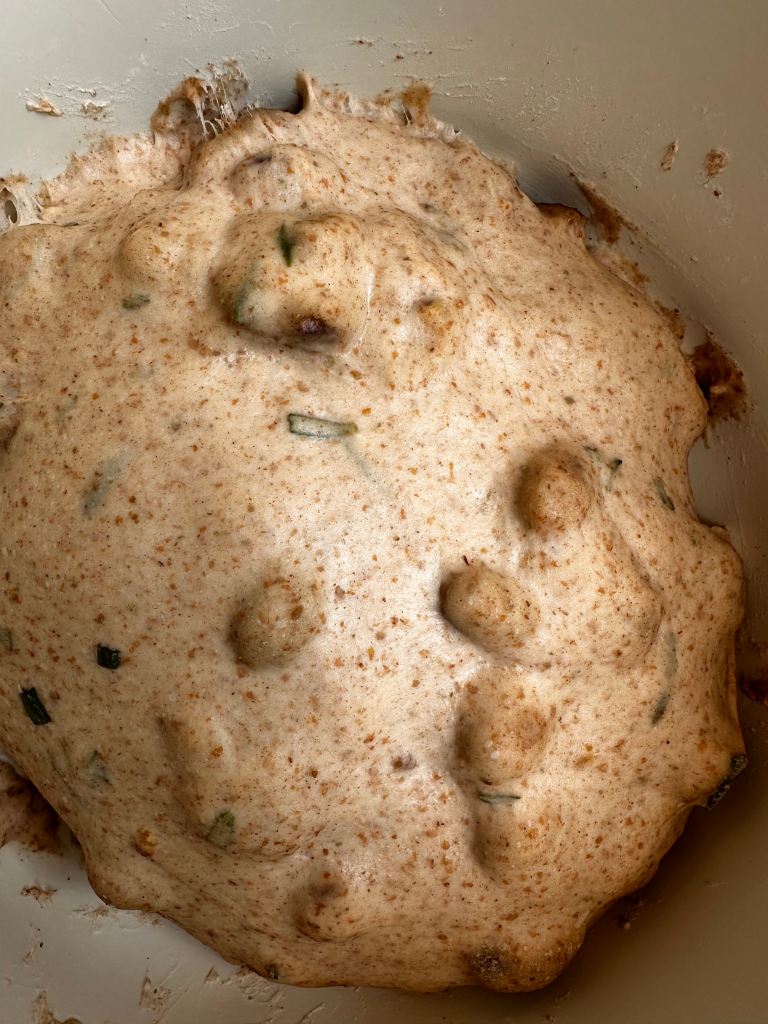 A tésztához adom a kovászt és a sót, majd dagasztani kezdem lassú fokozaton, kb. 6 percig. Utána gyors fokozatra kapcsolok és további 2 percet dagasztom. Arra figyelek, hogy a só és a kovász ne érintkezzen közvetlenül. Az ízesítő anyagokat a dagasztás után adom a tésztához és lassan járatom a gépet kb. 1 percig.