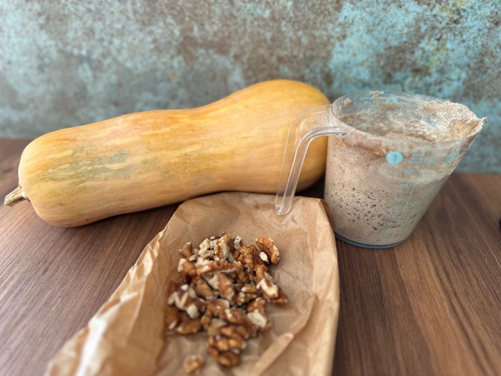A tésztához adom a kovászt, majd dagasztani kezdem lassú fokozaton, kb. 6 percig. Utána hozzáadom a sót és a főtt sütőtököt, majd további egy perc lassú fokozat után gyorsabbra kapcsolok és további 2 percet dagasztom. Miután a tönköly liszttől és a tök nedvesség tartalmától terülős lesz a tészta, figyelem a dagasztást, a tészta állagát és ha szükséges, még teszek hozzá lisztet. Közben egy pici olajon megpirítom a diót.