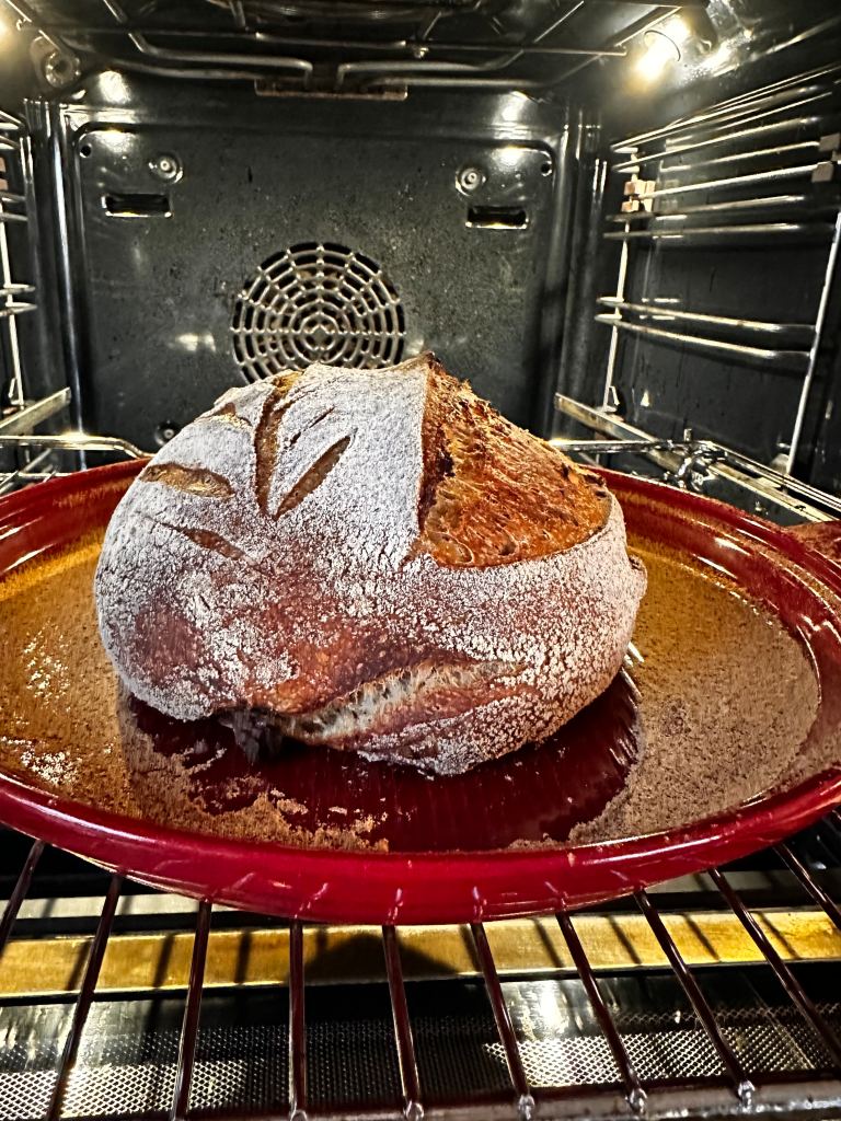 A hűtőben kb. 12 órát pihent a tészta. Felforrosított, 240 fokra felfűtött sütőbe előmelegítem a sütőedényem, majd ebben sütöm meg a kenyeret végig ezen a hőfokon 35 perc alatt úgy, hogy az utolsó 15 percben leveszem a fedőt.
