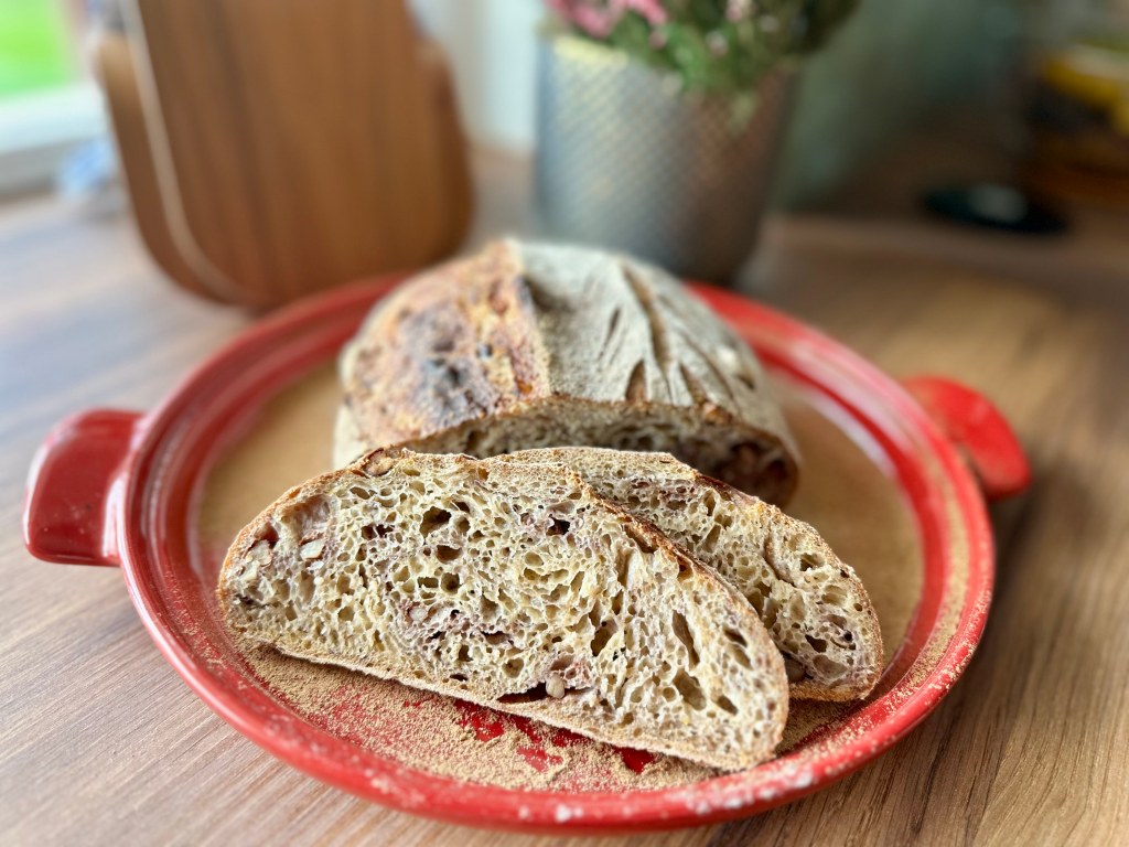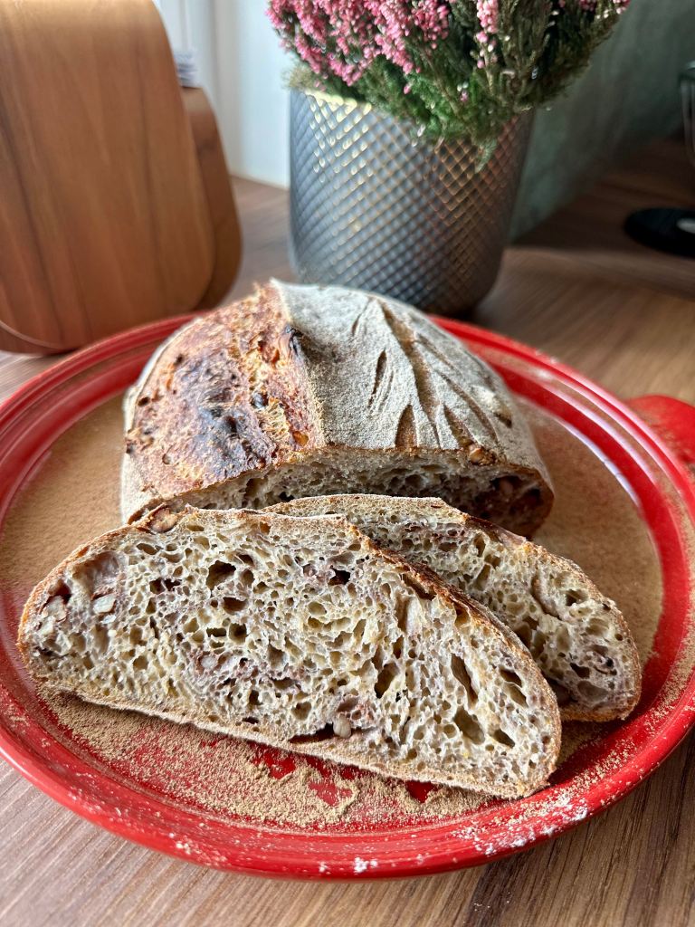 A tésztát 40 fokra előmelegített sütőbe teszem és fél óránként áthajtom szirom hajtással. Összesen 2.5 órát hagyom a tésztát érni. A diót az első hajtásnál kézzel teszem bele a tésztába.