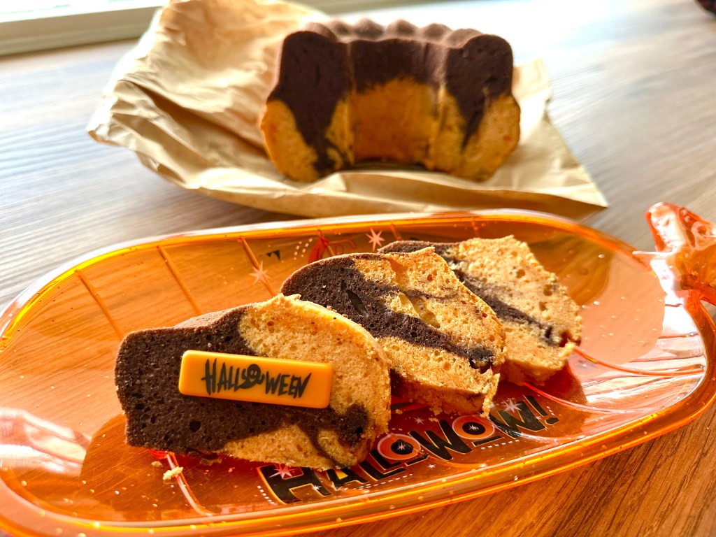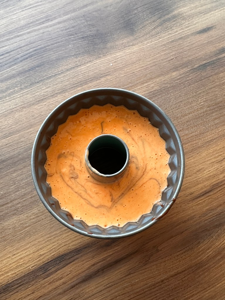 A tojásokat a cukorral elektromos habverővel jól felverem. Belecsorgatom az olajat és beleteszem a megfőtt/megsült sütőtököt. Összedolgozom a habverővel a masszát. Egy másik edényben összekeverem a lisztet és a sütőport. Beleöntöm a tojásos részbe és az egészet ismét összedolgozom. Ha jó sárga a tök, jó narancssárga lesz a tészta. A tésztát nagyjából ketté osztom és az egyik részhez hozzákeverem a kakaóport. A tészta egyik részét a kiolajozott forma aljába öntöm, a másikat pedig rá. Egy pálcikával kicsit összekeverem ott, ahol a két rész találkozik, hogy kicsi „szellemesebb” legyen a süti. 170 fokon 20-25 perc alatt megsütöm, a végén tűpróbával ellenőrzöm, hogy mindenhol átsült-e a kuglóf.